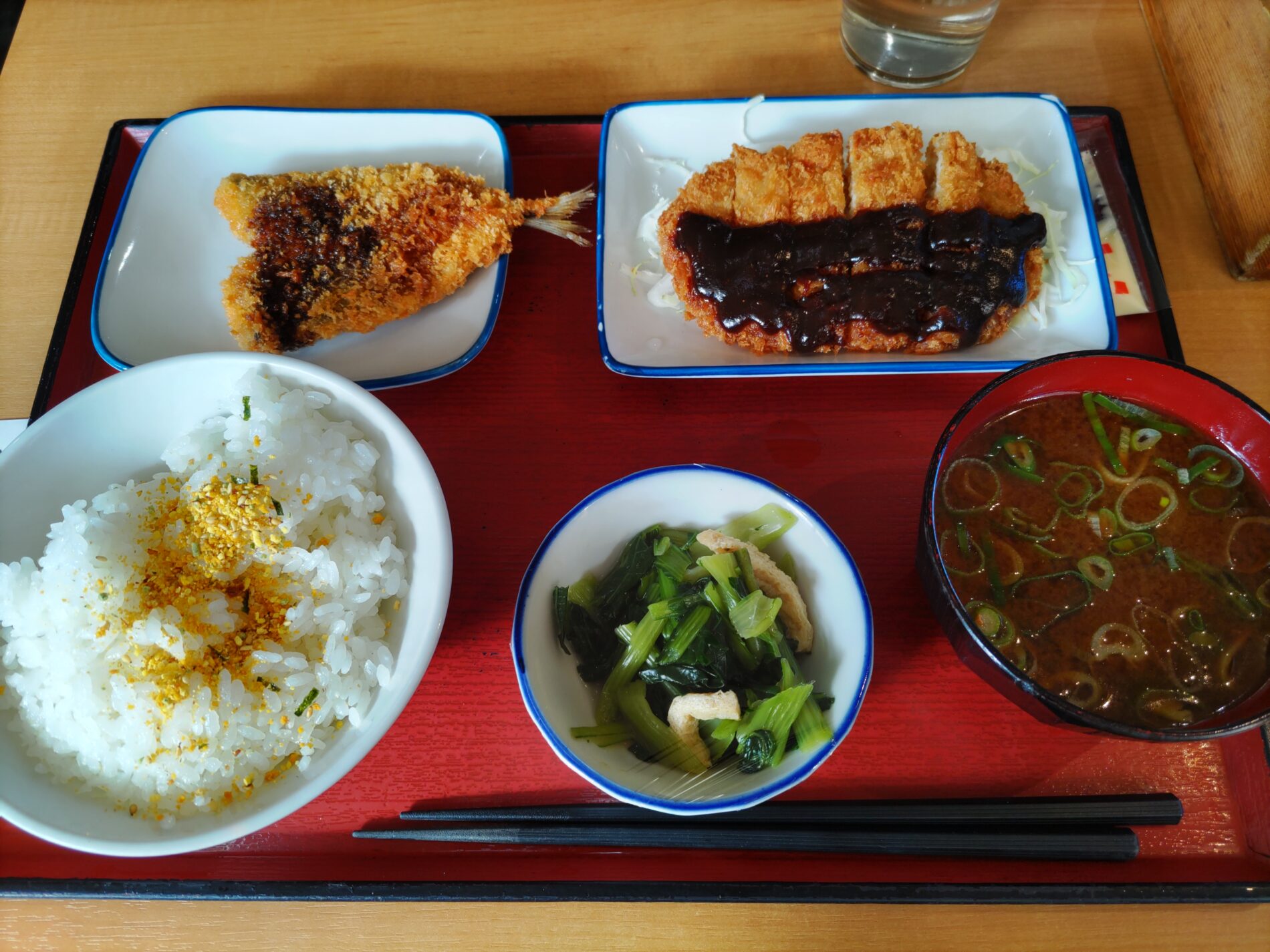 先日、そんな「ひるめし」の匂いがするお店に偶然出会いました。 初めての店でのカフェテリア形式は、勝手がわからずつい戸惑ってしまいます。 アジフライ、味噌カツ、ほうれん草のお浸し豆腐添え、赤だしのお味噌汁、そしてふりかけ付きのご飯(中盛り)。 お盆の上は少しまとまりがないけれど、見渡せばやはり、ここも「ザ・働くガンバルマン」たちのオアシスでした。