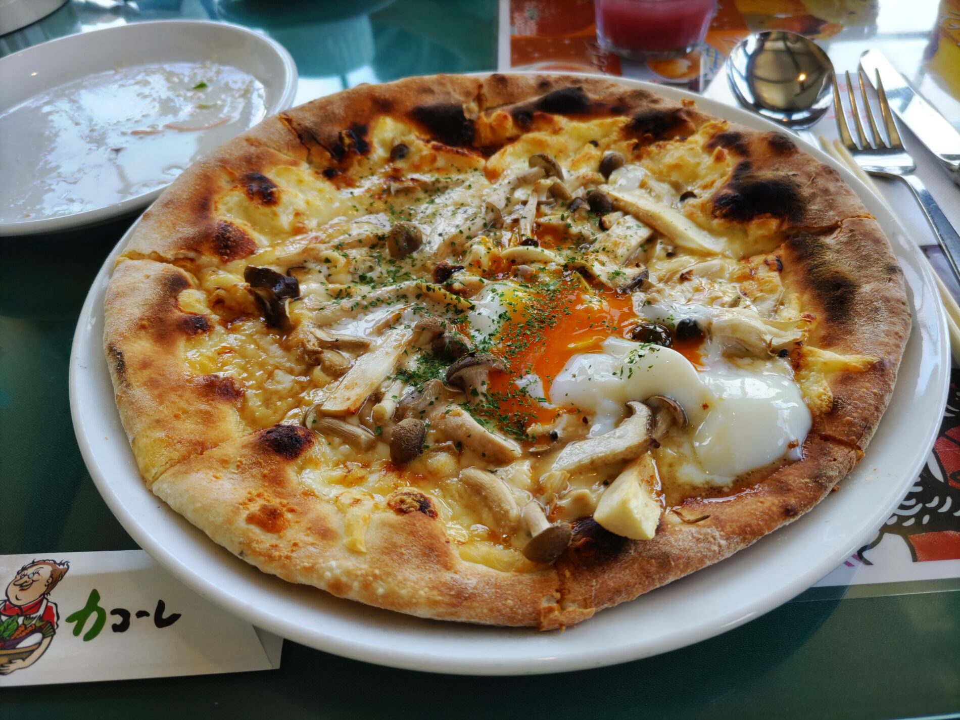 いただいたサラダは、彩り豊かでボリューム満点! メインには「キノコと名古屋コーチンの卵のピザ」をいただきました。こちらもボリュームたっぷりで、半分食べたあたりでお腹がいっぱいになるほどの満足感でした。 季節のデザート「栗のシャーベット」も、少し珍しくて嬉しかったです。