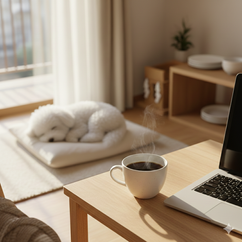 カタカタと乾いた音が響くなか、チョコチョコと小さな足音が近づいてきます。愛犬が起きてきた合図です。 ふと立ち止まってこちらを見上げる愛犬に、「おはよう」と声をかける。 愛犬はまた寝床に戻ったり、リビングを気ままに歩き回ったり。「置いておくぞ」と小声で声かけながら、お皿に新鮮な水を汲んで台に置きます。それを飲むか飲まないかは、彼の気分次第。