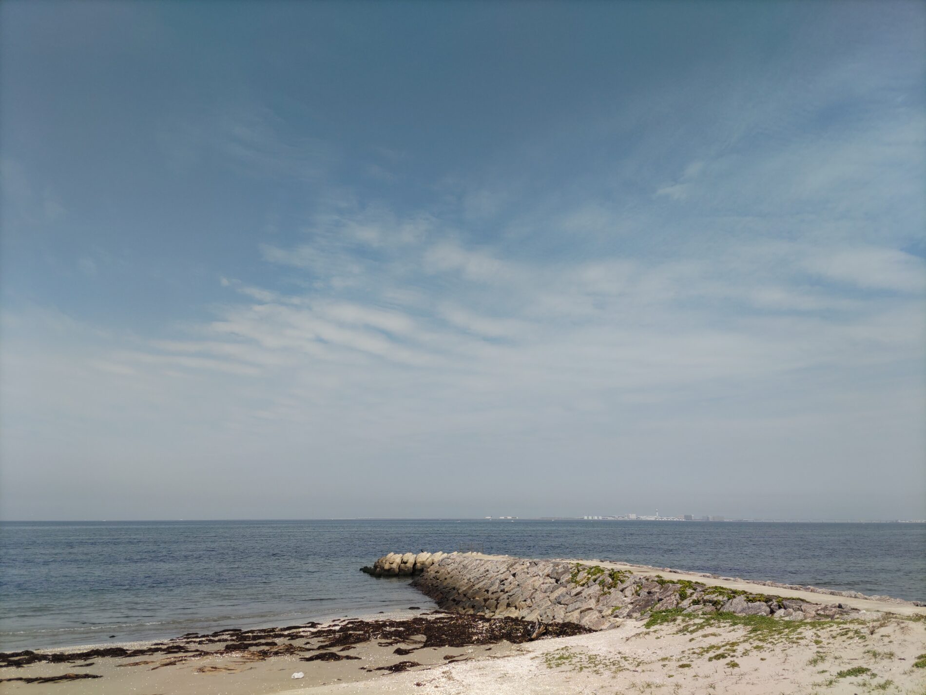 砂浜には打ち上げられた海藻が名残のように残っていますが、すぐ足元までおだやかな波が寄せては返し、春の海らしい優しい表情を見せてくれます。